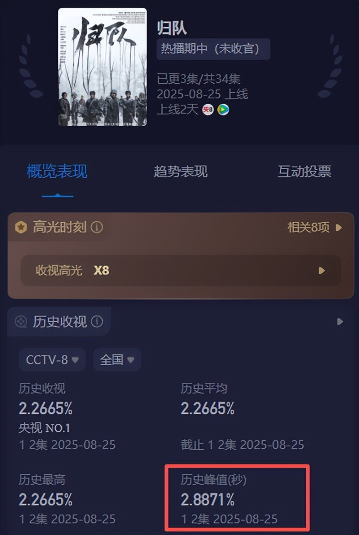 《归队》上星央视八套,仅播1晚收视率峰值轻松破2.8,拿下全国收视第一的好成绩,看来国产抗战传奇剧也迎来新的天花板了。